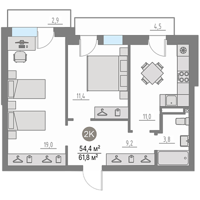 2-комнатная №25, 54.4 м²