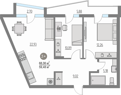 3-комнатная №квартира №19, 68.06 м²