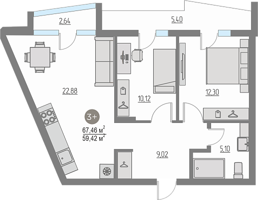 3-комнатная №квартира №43, 67.46 м²