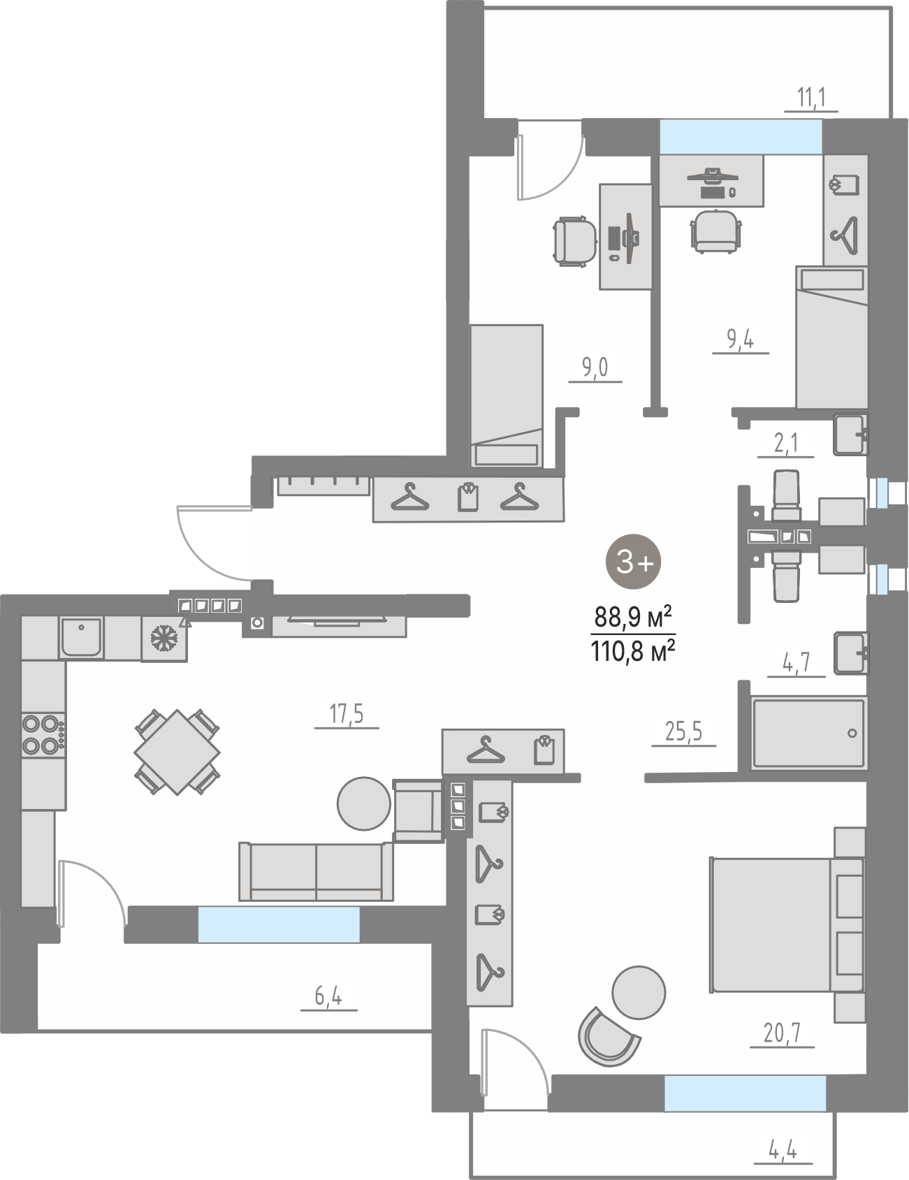 Мы сдаём квартиру с отделкой white box. В жилых комнатах на полу выполнена стяжка со звукоизоляцией, в санузлах, балконах и террасах - с гидроизоляцией. Стены выравнены "под маяк".