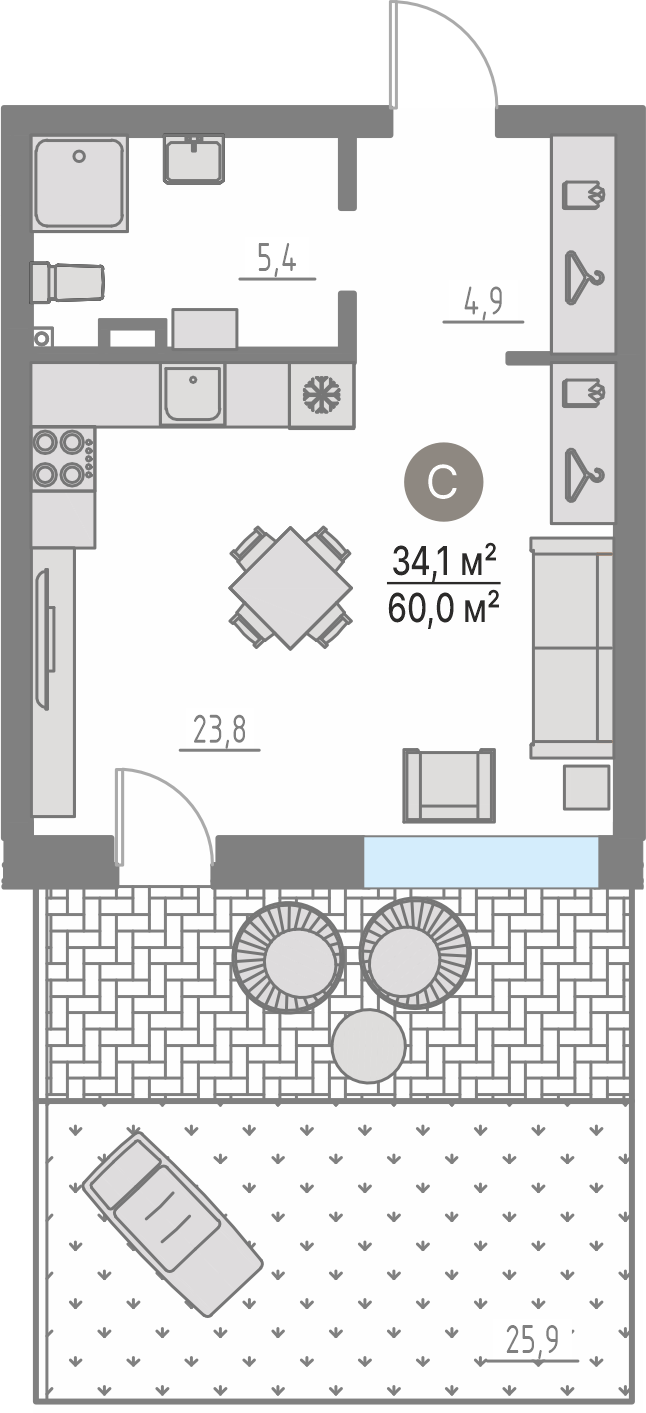 Мы сдаём квартиру с отделкой white box. В жилых комнатах на полу выполнена стяжка со звукоизоляцией, в санузлах, балконах и террасах - с гидроизоляцией. Стены выравнены "под маяк".