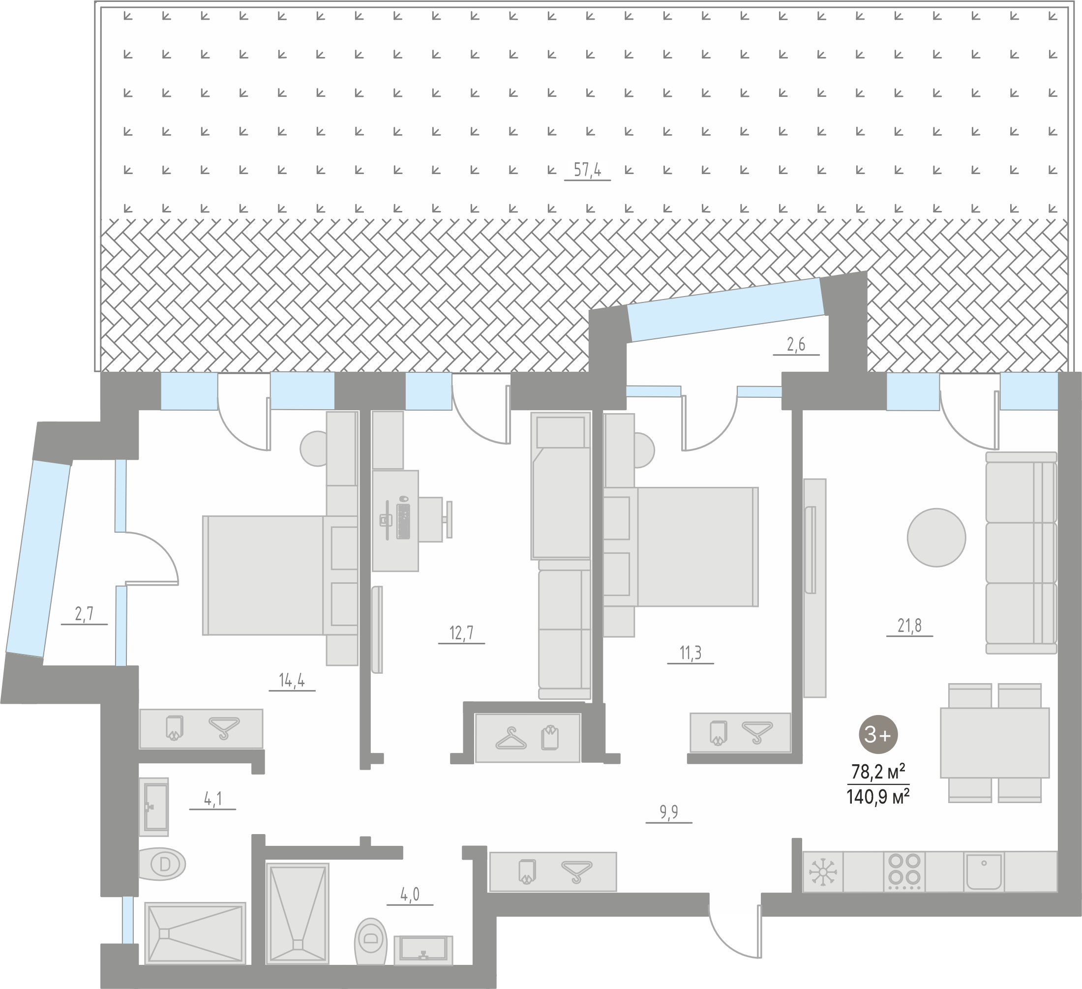 Мы сдаём квартиру с отделкой white box. В жилых комнатах на полу выполнена стяжка со звукоизоляцией, в санузлах, балконах и террасах - с гидроизоляцией. Стены выравнены "под маяк".