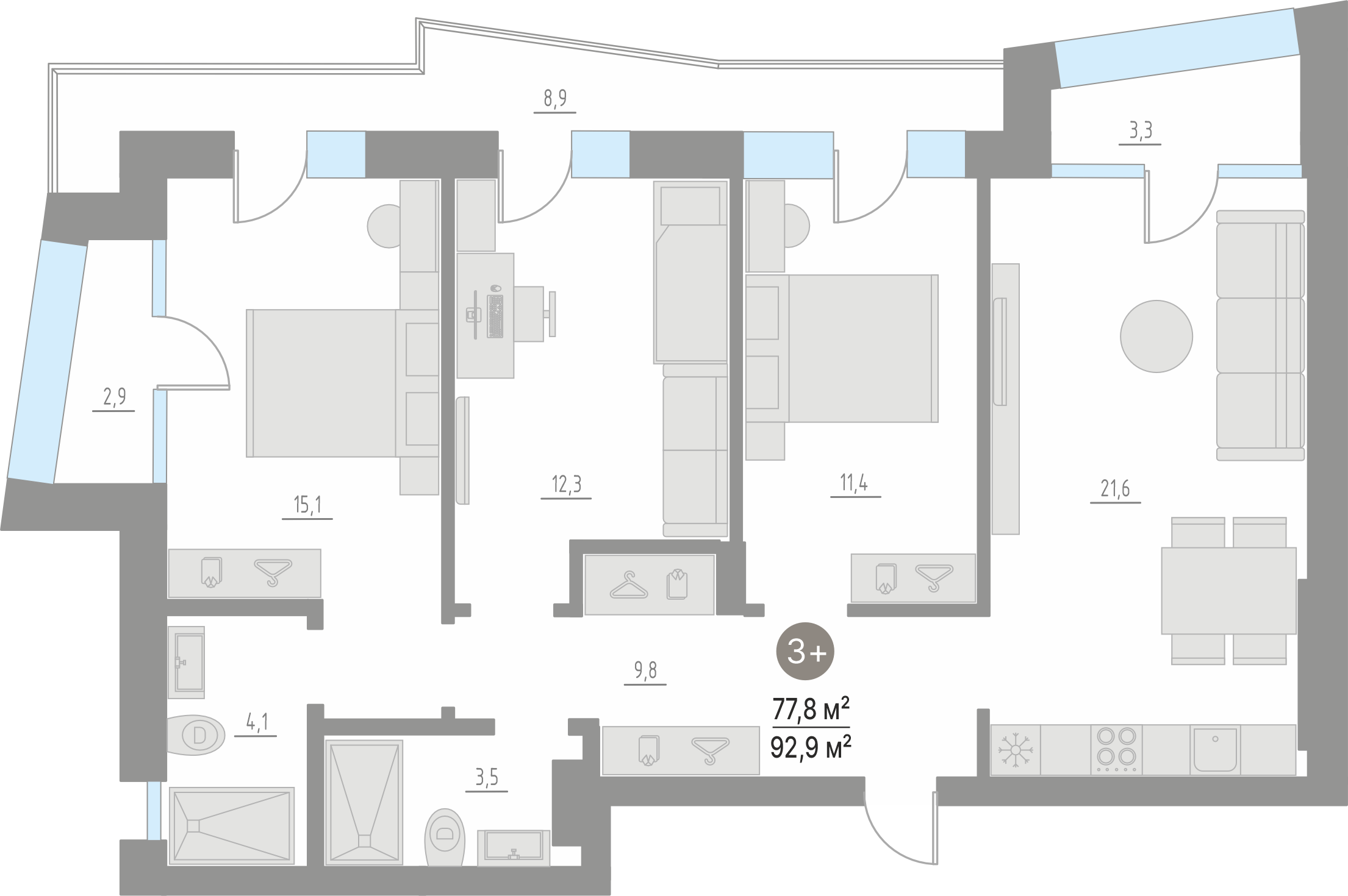 Мы сдаём квартиру с отделкой white box. В жилых комнатах на полу выполнена стяжка со звукоизоляцией, в санузлах, балконах и террасах - с гидроизоляцией. Стены выравнены "под маяк".