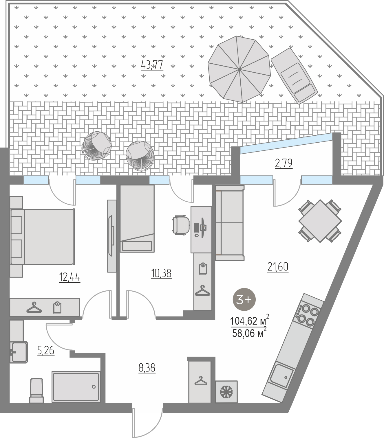 Мы сдаём квартиру с отделкой white box. В жилых комнатах на полу выполнена стяжка со звукоизоляцией, в санузлах, балконах и террасах - с гидроизоляцией. Стены выравнены "под маяк".